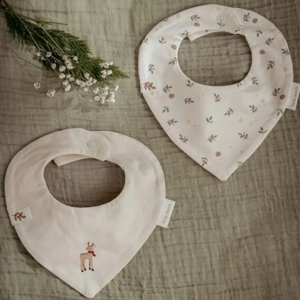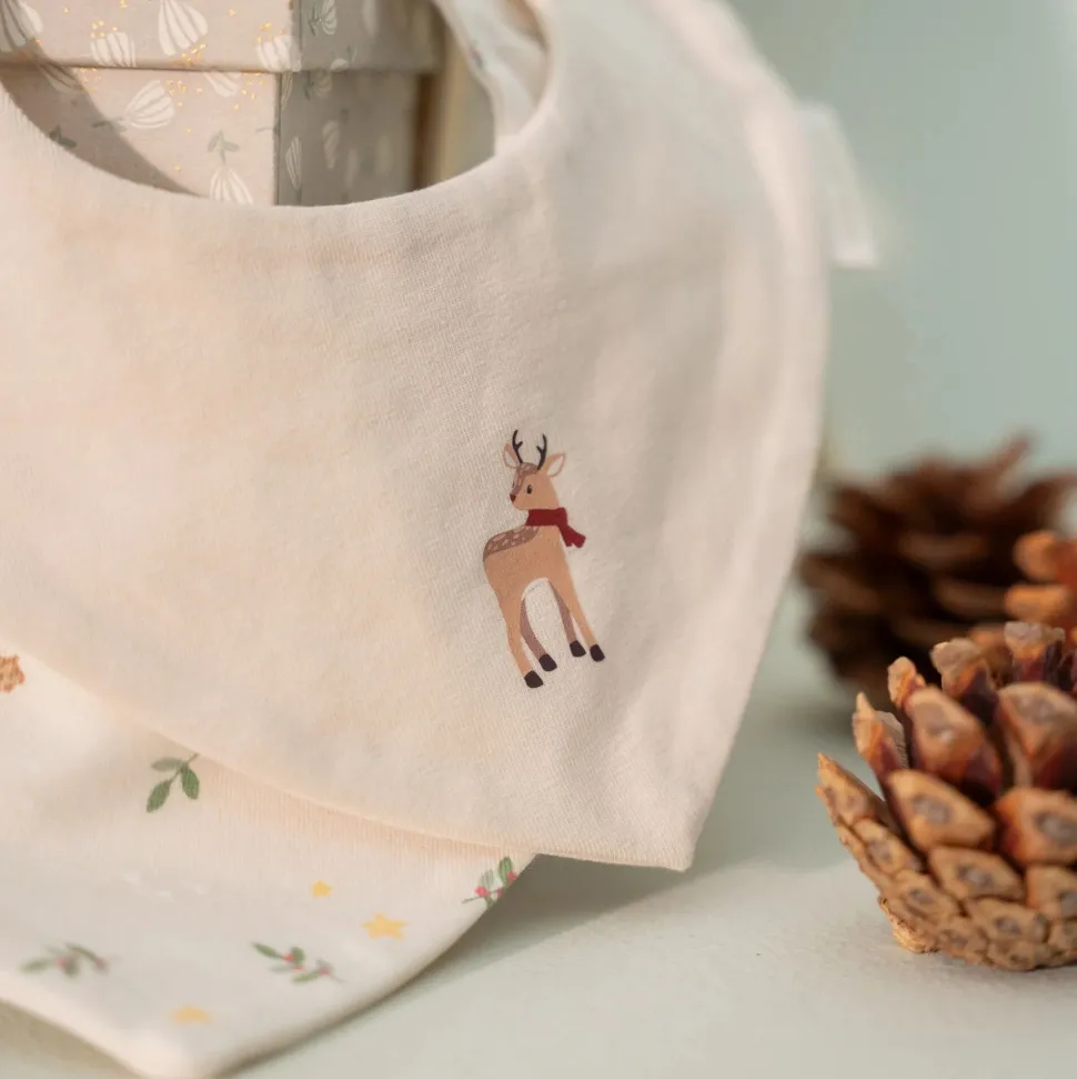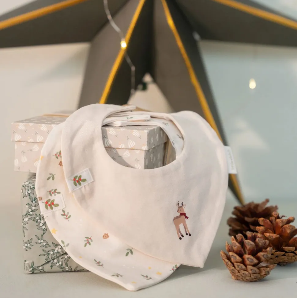 Ideaal om knoeien stijlvol tegen te gaan tijdens de kerstmaaltijden! Deze 2-pack slabbetjes met Little Christmas print zijn perfect voor de feestdagen. Ze zijn verstelbaar met twee drukknoopjes voor een comfortabele pasvorm en gemaakt van 100% biologisch katoen. Niet alleen praktisch, maar ook ontzettend schattig.
