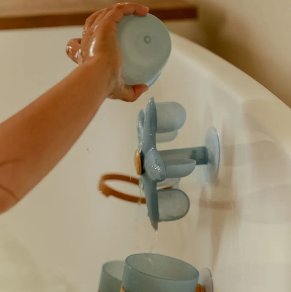 Maak van badtijd een feestje met deze blaue badbekerset! De set bestaat uit een draaiend rad in de vorm van een ster, twee vrolijke badbekers en een handige schenkbeker. Met de zuignappen hang je ze eenvoudig aan de bad- of douchewand. Giet water in de steren zie hoe het rad begint te draaien. Spelen met water prikkelt de nieuwsgierigheid en stimuleert de motoriek. Dankzij de zachte kleuren en het slimme ontwerp beleef je samen de mooiste wateravonturen.