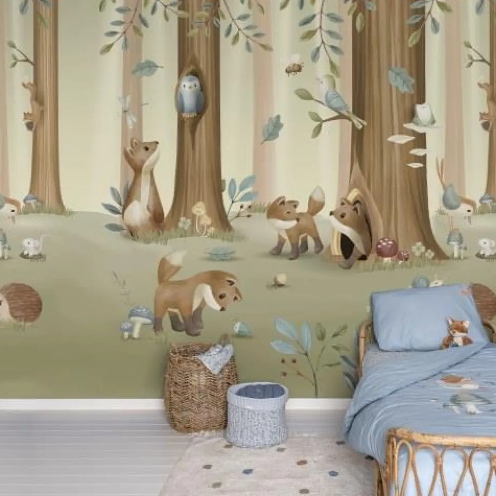Breng het bos tot leven in de kinderkamer met ons Forest Friends fotobehang! Dit prachtige digitale behang toont een vrolijke verzameling dierenvriendjes, zoals vosjes, egels, slakken en een wijze uil. Omringd door bladeren, paddenstoelen en het groene bos, creëert dit ontwerp een speelse en avontuurlijke sfeer. Perfect om je kind te laten wegdromen in een wereld vol natuur en avontuur. Het fotobehang is 300x280cm.