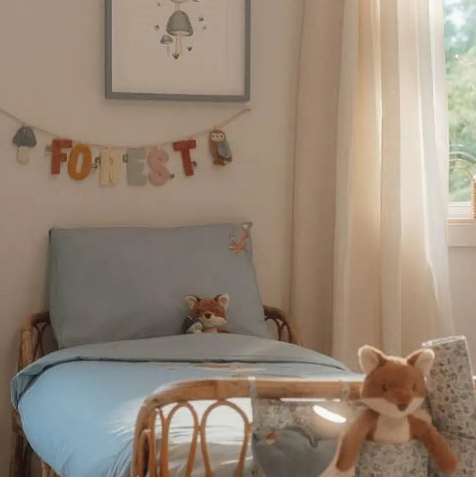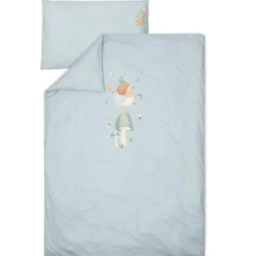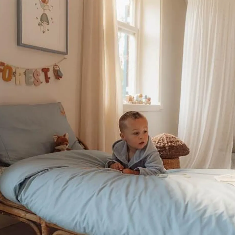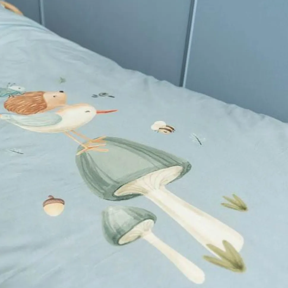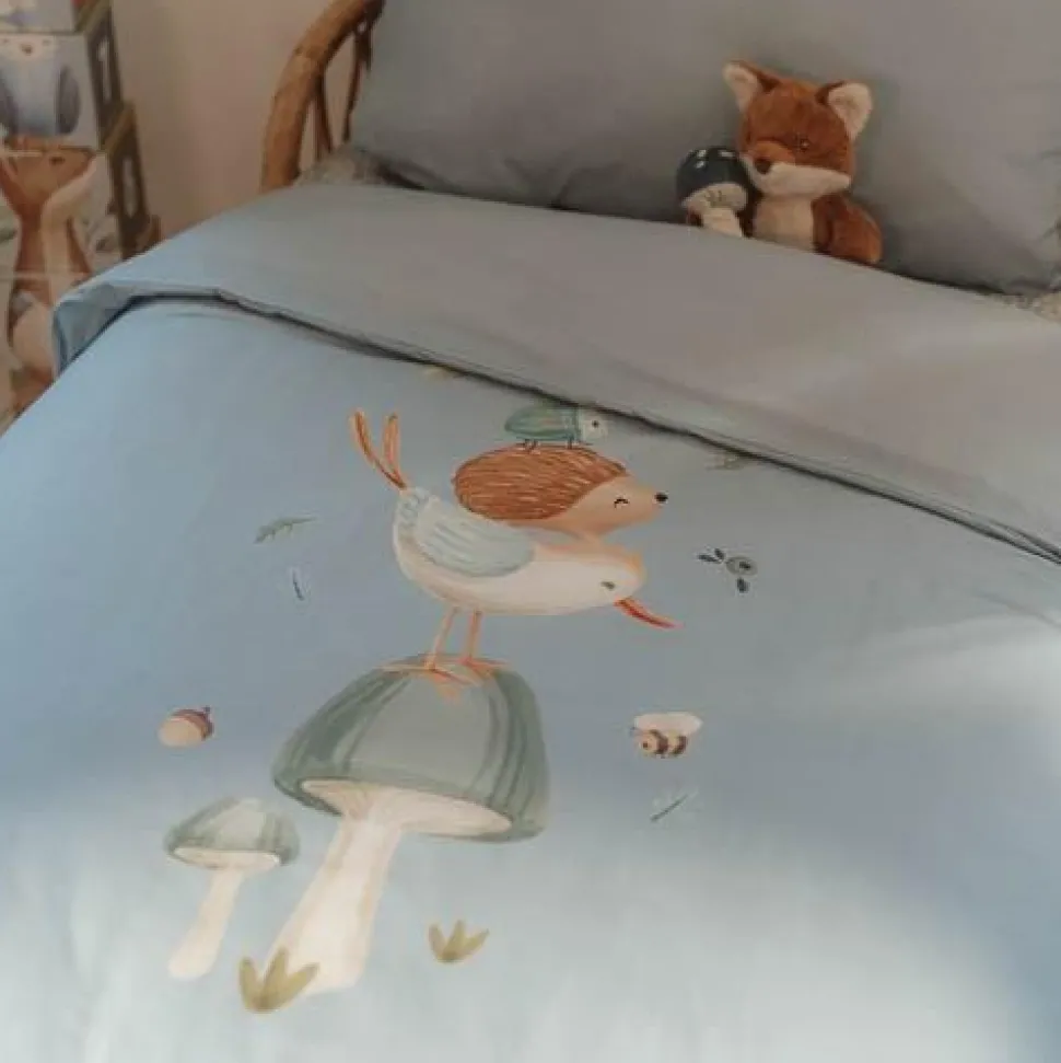 Voeg een vleugje design toe aan de kinderkamer met een prachtig opgemaakt bed. Met dit dekbedovertrek voor een ledikant zal je kleintje heerlijk wegdromen naar avontuur. Het collectie Forest Friends inspireert de mooiste dromen over een avontuurlijk bos waarin een vogel, egeltje en kevertje balanceren op een paddenstoel. Het zachte dekbedovertrek is gemaakt van 100% biologisch in een effen Denim Blue kleur versierd met een speels tafereel uit het bos. Zowel de kussensloop als het dekbedovertrek zijn comfortabel, mooi afgewerkt en hebben een goed ademend vermogen. Het formaat van het dekbedovertrek is 110 x 140 cm en de kussensloop is 40 x 60 cm.