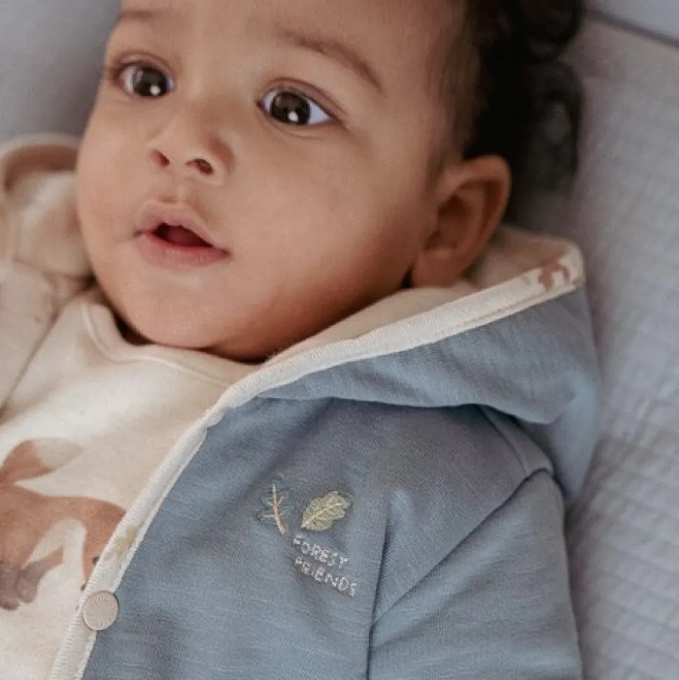 Een laagje stijl voor koudere lentedagen en koele zomeravonden. Deze schattige reversible jas is met zorg en liefde ontworpen voor stijlvol comfort voor je pasgeboren baby. Gemaakt van lichtgewicht en zachte joggingstof, is deze jas perfect om je kleintje warm en knus te houden. Aan de ene kant vind je een subtiele blauwe kleur met zandkleurige boorden, en een klein borduursel van bosblaadjes. Draai het binnenstebuiten en dan komt de mooie Forest Friends-print naar voren, vol bladeren, eikels, paddenstoelen, vossen, egels en meer. Gemaakt van biologisch katoen, licht gewatteerd met een drukknoopsluiting, zorgt deze omkeerbare jas zowel voor comfort als geborgenheid voor je pasgeboren kindje. Het jasje past naadloos bij alle items uit de Forest Friends-collectie en is verkrijgbaar in maten 44, 50, 56, 62, 68 en 74.