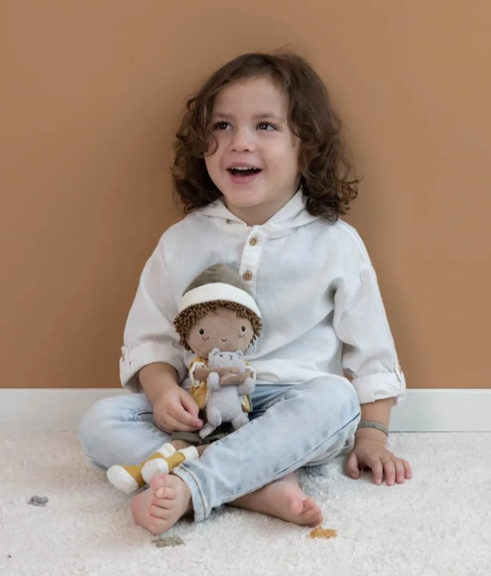 Dit is de stoere Jake. Deze pluche knuffelpop met zijn stoere muts en gele regenlaarzen kan niet wachten om geknuffeld te worden. Jake wordt je nieuwe beste vriend. Hij zal er altijd zijn als je wilt spelen of een dikke knuffel nodig hebt. Samen met zijn grijze kat zoekt hij graag naar kleine schatten. Of het nu in huis is of op het strand, hij weet altijd iets bijzonders te vinden. Wat zal de eerste schat zijn die jullie samen zullen vinden? Jake is zacht en knuffelig, 35 cm lang en is verpakt in een mooie opbergdoos.