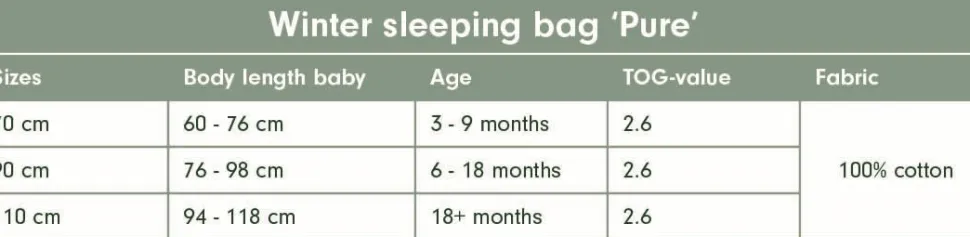 | Waarschuwing | WAARSCHUWING! Niet gebruiken als het hoofd van het kindje door de halsopening kan schuiven. Zorg dat de hals- en mouwopeningen goed gesloten zijn. Niet gebruiken als het kind uit het bed kan klimmen. Niet in combinatie met een dekbed of deken gebruiken. Houd rekening met de kamertemperatuur en de slaapkleding van het kind. Oververhitting kan het leven van het kind in gevaar brengen! Stop met gebruik van de slaapzak als deze beschadigd is. Uit de buurt van vuur houden. Onderhoudsinstructies conform EN ISO 3758. Niet professioneel droogreinigen. |
