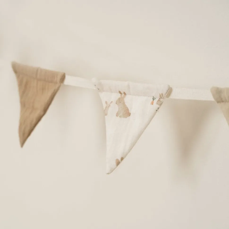 Vrolijk de babykamer op met deze mooie slinger van vlaggetjes. Wie zegt dat slingers alleen voor feestjes zijn?! Ze fleuren een kamer meteen op. Aan de muur, om de klamboe, op een boekenplank of ter versiering van een speeltent. Ga creatief aan de slag met deze charmante stoffen slinger in zachte kleuren. De slinger is gemaakt van 100% biologisch katoen en heeft een lengte van 200 cm.