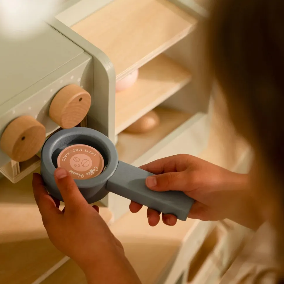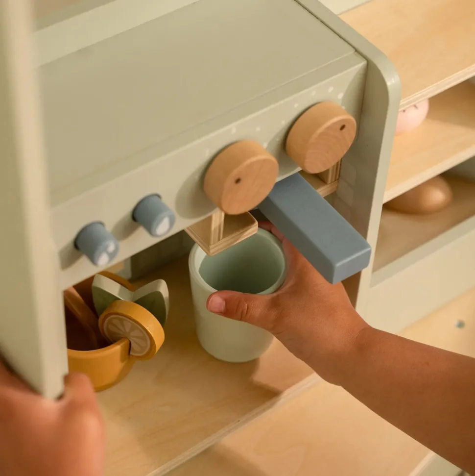 Welkom in de gezelligste koffiehoek! Serveer een heerlijk kopje koffie of thee met een vers broodje of taartje erbij. Met deze prachtige speelgoed koffiecorner kan je kleintje knoppen indrukken, de juiste stand kiezen en een koffiepad plaatsen voor een echte barista-ervaring. De set bevat een koffie- en theeapparaat, een opbergruimte voor kopjes en een kastje om alle lekkernijen mooi uit te stallen. Wie komt er iets lekkers bestellen?