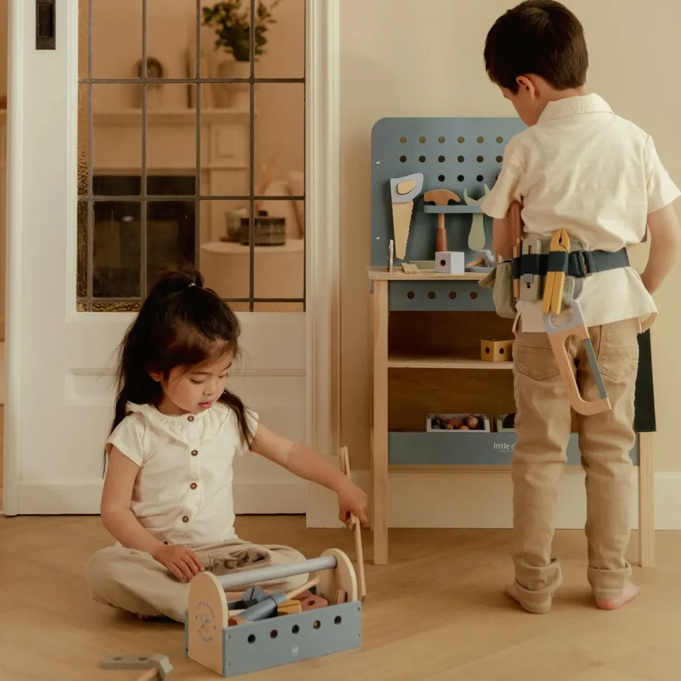 Alles wat een kleine timmerman of timmervrouw nodig heeft! Deze houten gereedschapskist bevat een hamer, schroevendraaier en moersleutel – perfect voor het bouwen van de mooiste creaties. Maar dat is nog niet alles – via de zijkanten kan de kist ook als hamerbank worden gebruikt! Zo kunnen kleintjes timmeren en schroeven terwijl ze spelenderwijs hun motoriek en creativiteit ontwikkelen. Klaar om aan de slag te gaan?