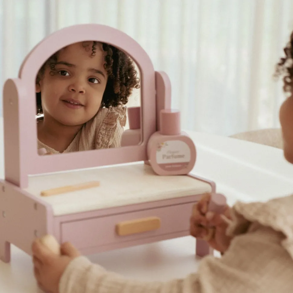 Zet je mooiste accessoires klaar en neem plaats voor de spiegel! Deze prachtige houten kaptafel heeft een draaiende spiegel en wordt geleverd met zes stijlvolle schoonheidsproducten, zoals een haarborstel, lippenstift en parfum. Perfect voor kleine beauty-liefhebbers die zich graag verkleden en tutten. Laat de fantasie maar stromen!