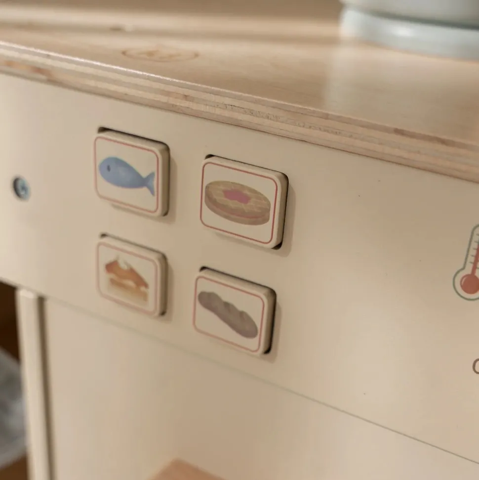 Kleine chefs opgelet! Dit prachtige houten kookstation is perfect om de lekkerste gerechten te bereiden. Bak een taart in de oven of kook verse groenten op het fornuis. De set bevat twee pannen, een pannenlap en een ovenwand en is uitgerust met drukknoppen met illustraties voor extra realisme. Combineer het kookstation met de koelkast of wasmachine- en vaatwasserset om een complete speelkeuken te creëren. Wat staat er vandaag op het menu?