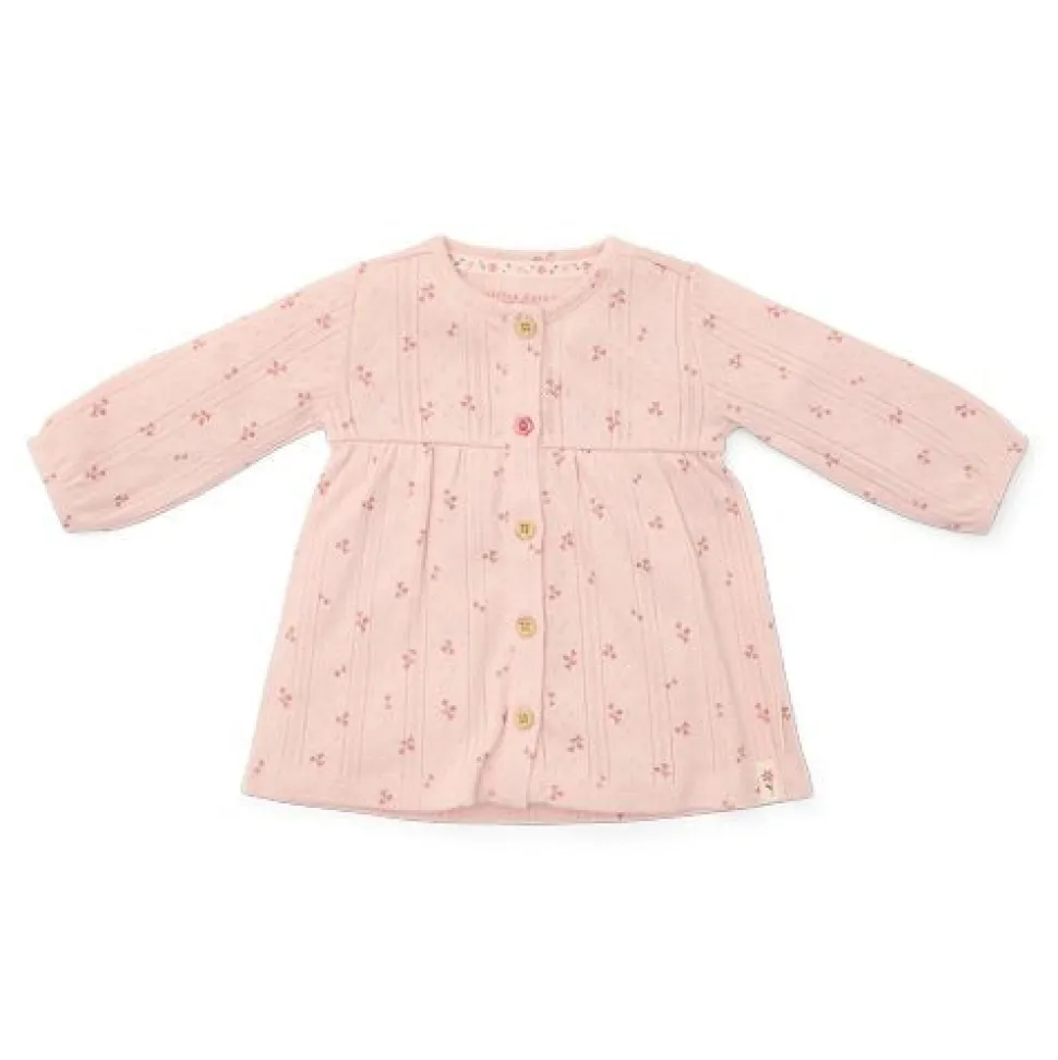 Klaar om weg te dromen in Fairy Flowers? Dit mooie jurkje zal de verbeelding van je kleintje prikkelen met een sprookjesachtige tuin vol bloemen. Gemaakt van zacht biologisch katoen, combineert het comfort met een prachtig ontwerp. De verfijnde pointelle structuur van de stof, in een prachtige lichte tint roze, is versierd met een betoverende print van kleine bloemetjes. De elastische zoom aan de lange mouwen geeft de jurk een verfijnde uitstraling. De sluiting met charmante hout-look knopen heeft één opvallende knoop in de vorm van een bloem. Combineer het met andere items uit de gecoördineerde Fairy Garden-collectie. Verkrijgbaar in maten 44, 50, 56, 62, 68 en 74.
