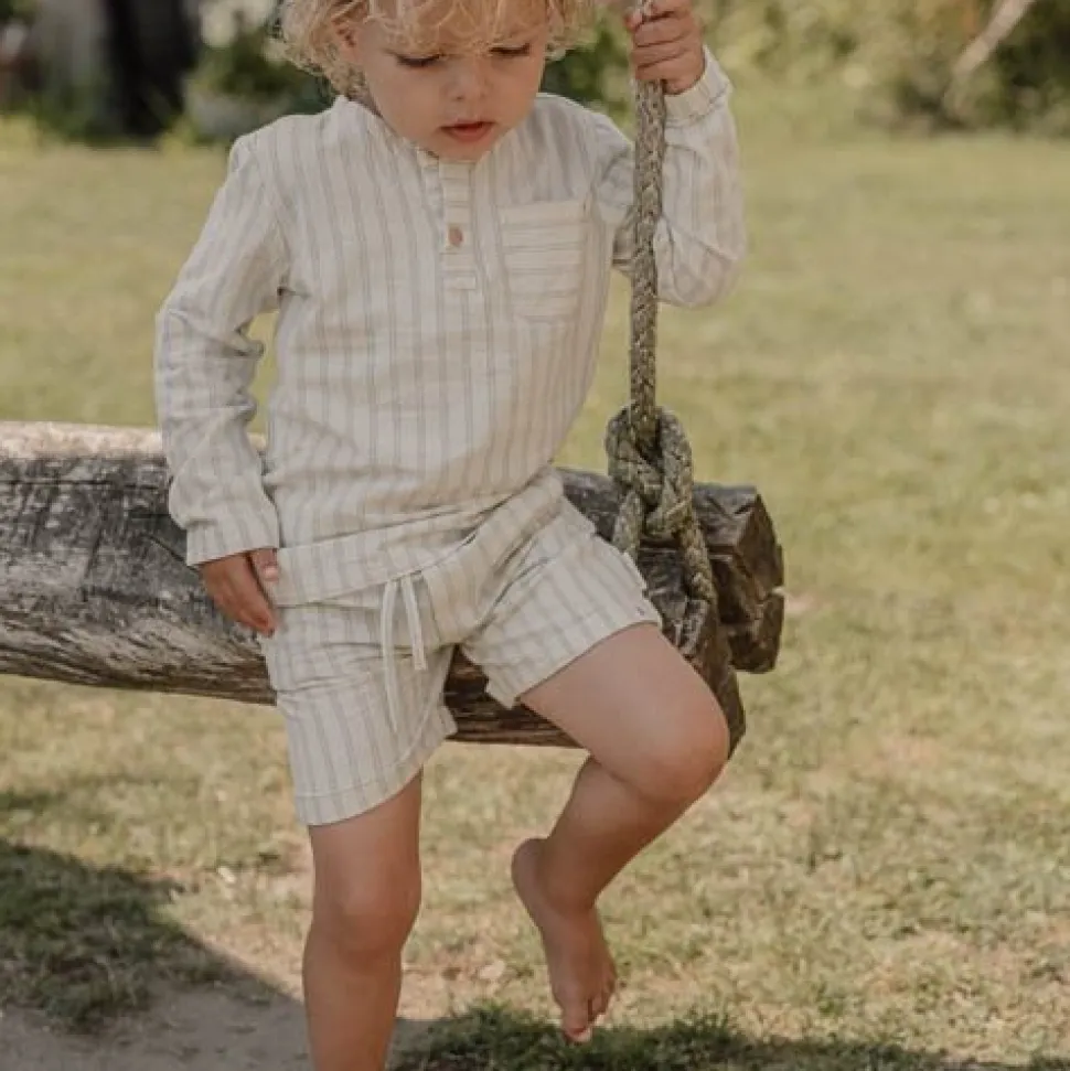 Perfect voor speciale gelegenheden en dagelijkse avonturen. Deze mooie linnen-look korte broek heeft een verfijnd Forest Green streepjespatroon. Gemaakt van biologisch katoen, heeft het een comfortabele pasvorm met omgeslagen pijpen, een elastische tailleband met trekkoord en handige steekzakken. Kies voor een co-ord set met de bijpassende trui, of mix en match met een willekeurig t-shirt uit de Forest Friends-collectie. Verkrijgbaar in maten 74, 80, 86, 92, 98 en 104.