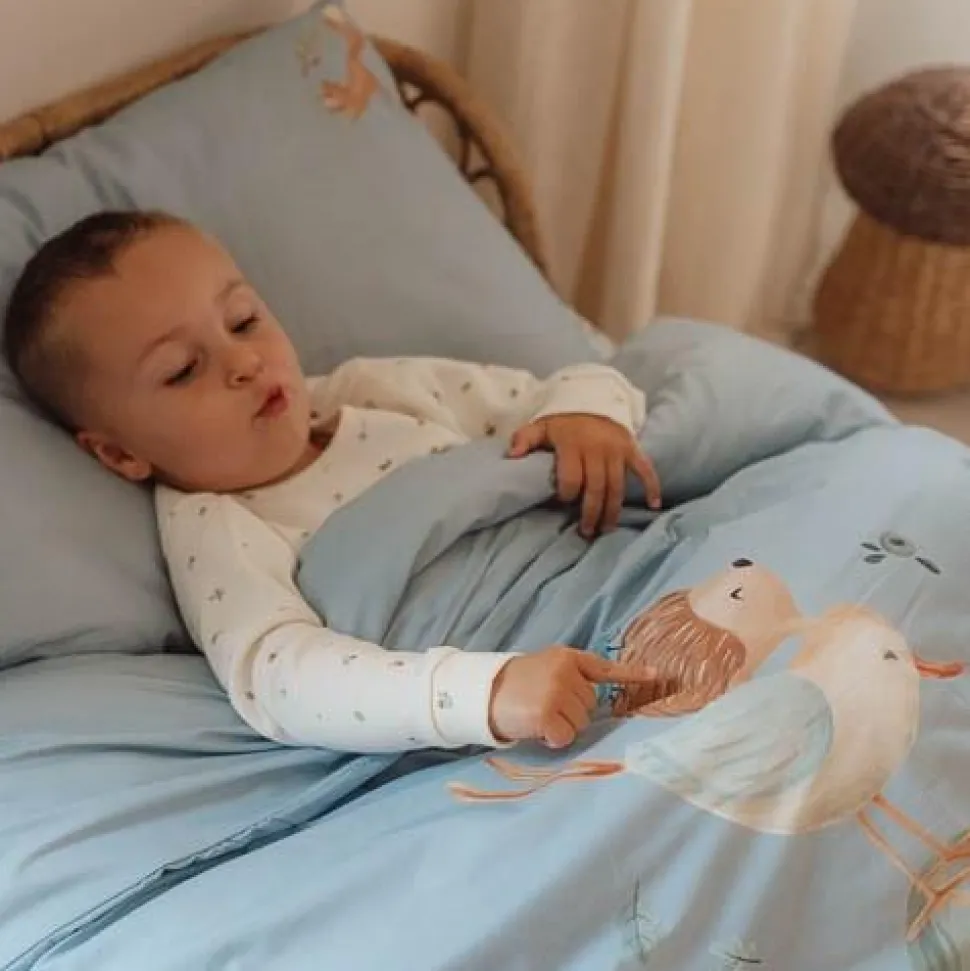 Voeg een vleugje design toe aan de kinderkamer met een prachtig opgemaakt bed. Met dit dekbedovertrek voor een ledikant zal je kleintje heerlijk wegdromen naar avontuur. Het collectie Forest Friends inspireert de mooiste dromen over een avontuurlijk bos waarin een vogel, egeltje en kevertje balanceren op een paddenstoel. Het zachte dekbedovertrek is gemaakt van 100% biologisch in een effen Denim Blue kleur versierd met een speels tafereel uit het bos. Zowel de kussensloop als het dekbedovertrek zijn comfortabel, mooi afgewerkt en hebben een goed ademend vermogen. Het formaat van het dekbedovertrek is 110 x 140 cm en de kussensloop is 40 x 60 cm.