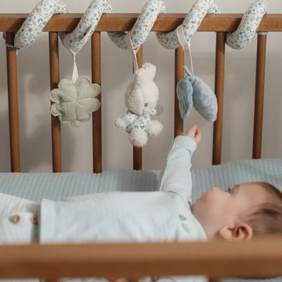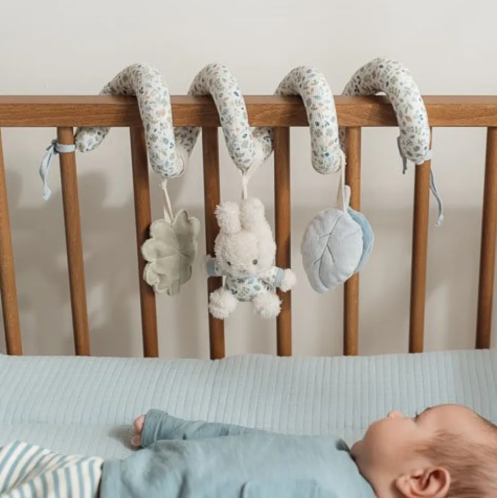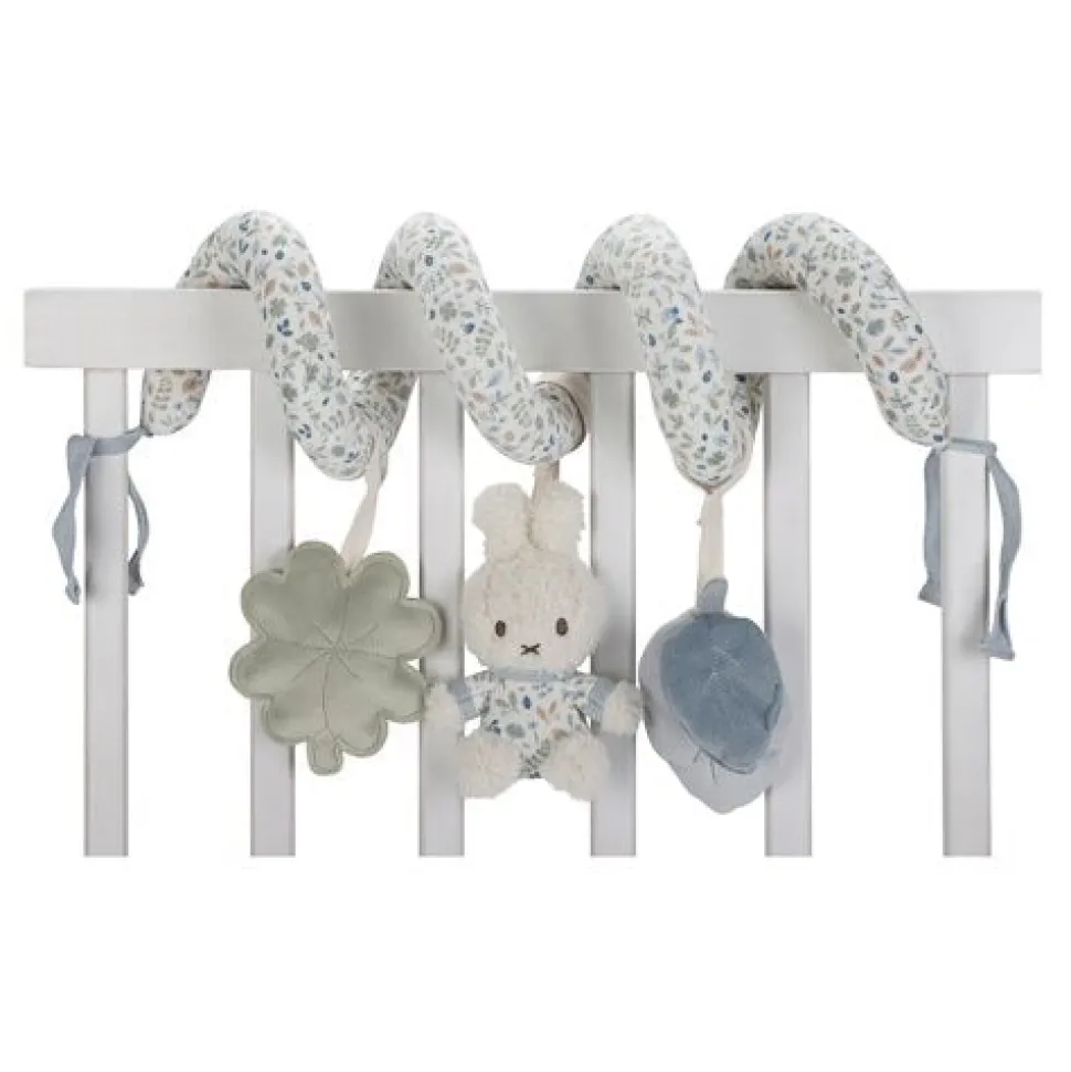 Kijk, voel en ontdek! Deze leuke en vermakelijke activiteitenspiraal zal baby’s zowel thuis als onderweg bezighouden. Bevestig dit praktische speelgoed eenvoudig met de touwtjes aan de uiteinden. Het versterkt de zintuigen en stimuleert de hand-oog coördinatie. De activiteitenspiraal is gemaakt van corduroy met katoen. Aan de spiraal is nijntje, samen met een klavertje vier en een blaadje bevestigd.