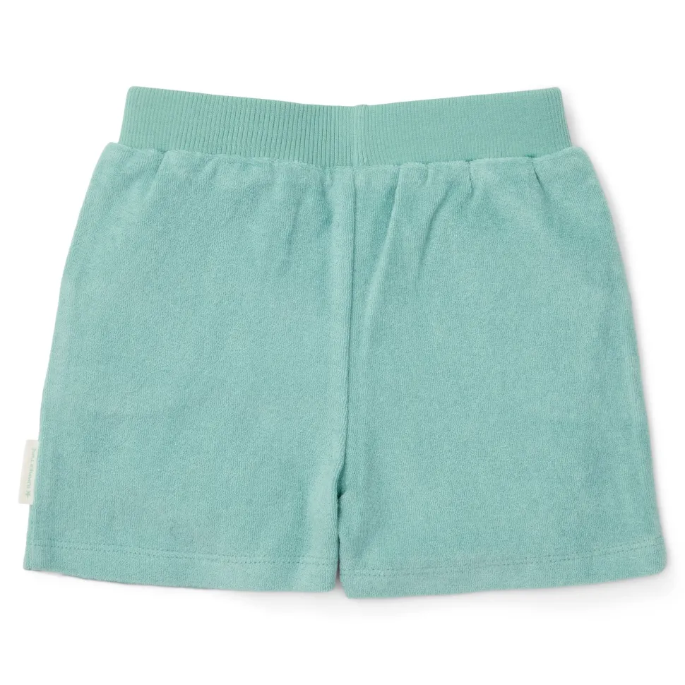 Geniet van de zomer met onze T-shirt en short set uit de collectie Seashells and Stripes in de kleur Surf Blue. Gemaakt van 100% organisch katoen in zachte terry badstof, biedt deze set ultiem comfort na het zwemmen of op zonnige dagen. De rug van het T-shirt is versierd met een print van iconische zeedieren, wat een speelse en avontuurlijke uitstraling geeft. Perfect voor een dag vol zomerse avonturen.