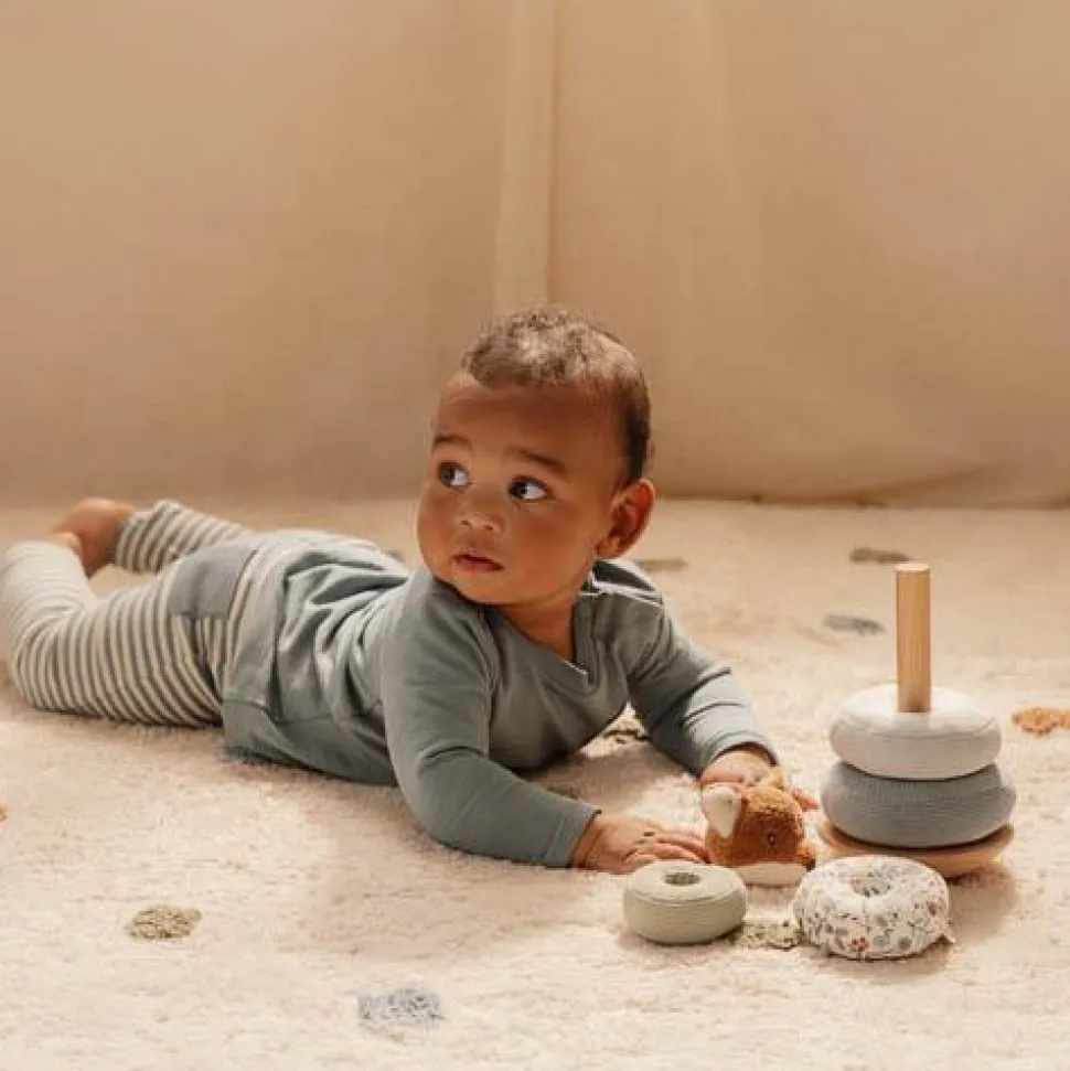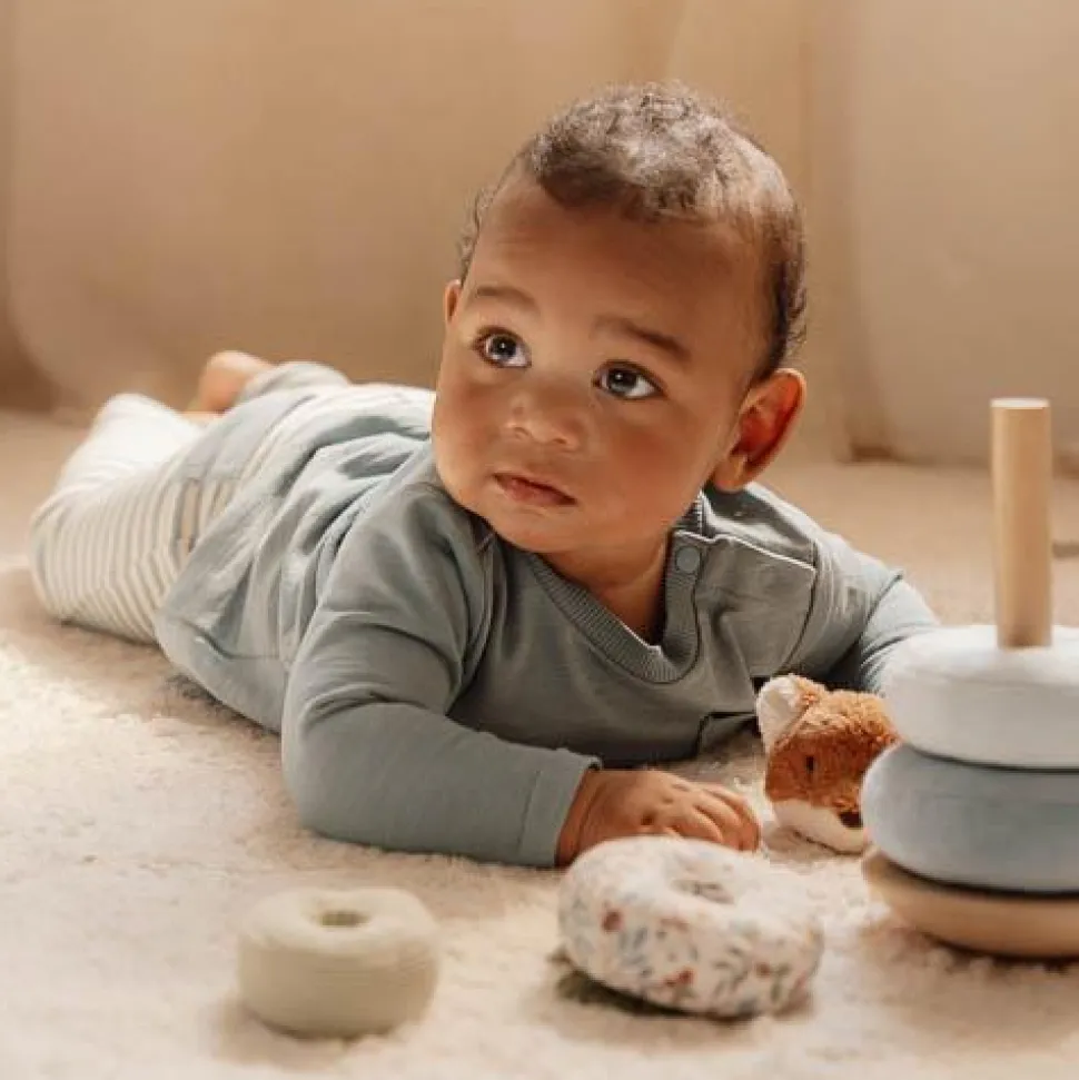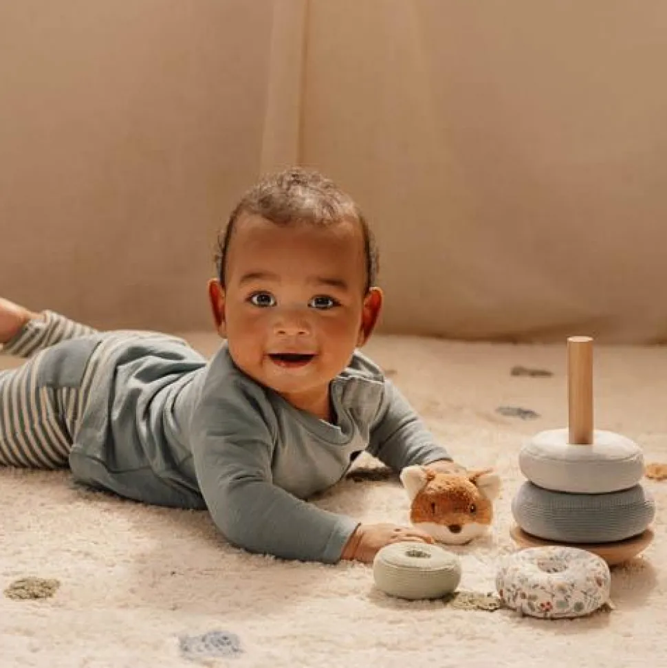 Stapel de ringen op de wiebelende basis en laat het vosje dansen en draaien! Het is best een uitdaging om de ringen te stapelen op een houten basis die heen en weer wiebelt. Maar het leuke vosje moedigt je aan om door te zetten, en zal het vieren met een klein dansje zodra de piramide af is. Elke mooie ring heeft een uniek ontwerp geïnspireerd op de Forest Friends collectie. Deze tuimelstapelaar is ontworpen om hand-oogcoördinatie te ontwikkelen door middel van plezier en hands-on spelen. Laat het stapelavontuur beginnen!