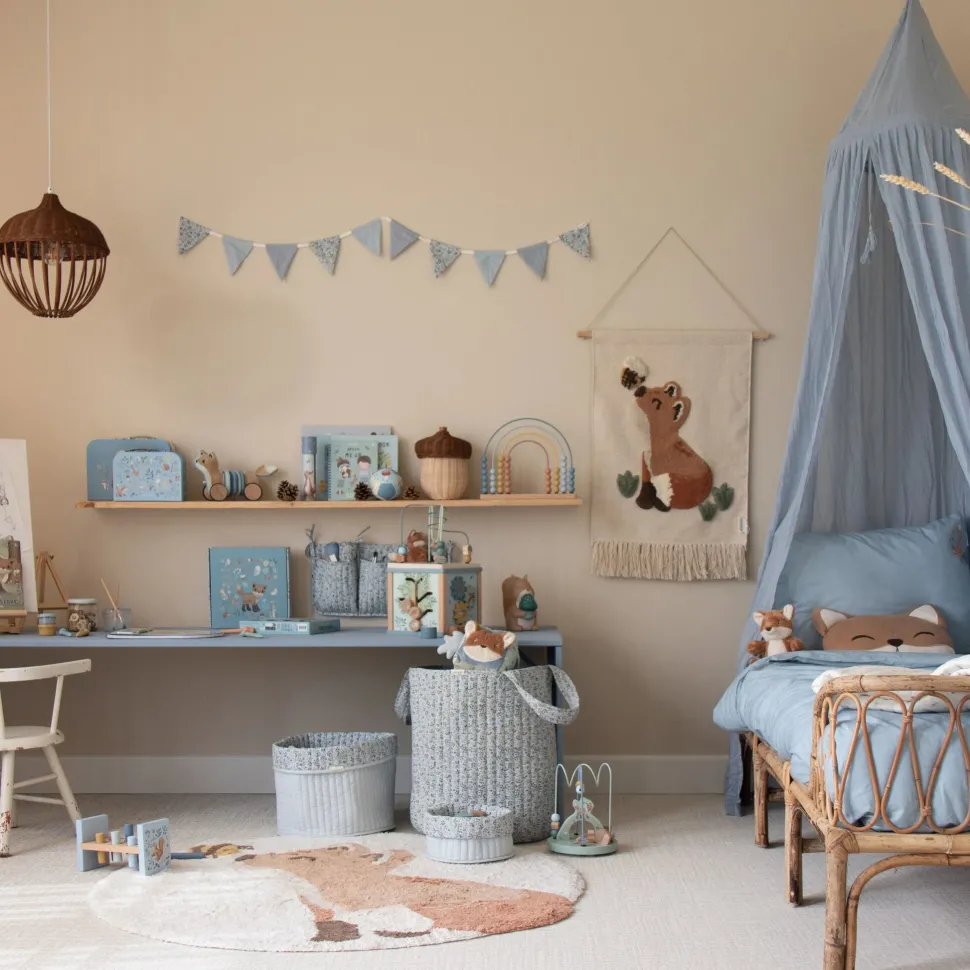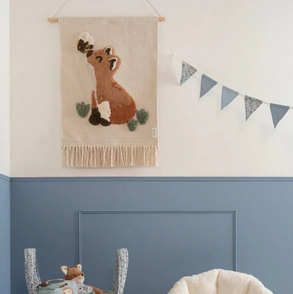 Geef de kinderkamer een warme, speelse touch met dit prachtige wandkleed uit de Forest Friends collectie. De lieve vos & bij, met zachte getufte details en charmante kwastjes, maakt de kamer extra knus. Gemaakt van biologisch katoen is dit wandkleed niet alleen stijlvol maar ook verantwoord. Perfect om de kamer van je kleintje af te maken en een gezellige sfeer te creëren.