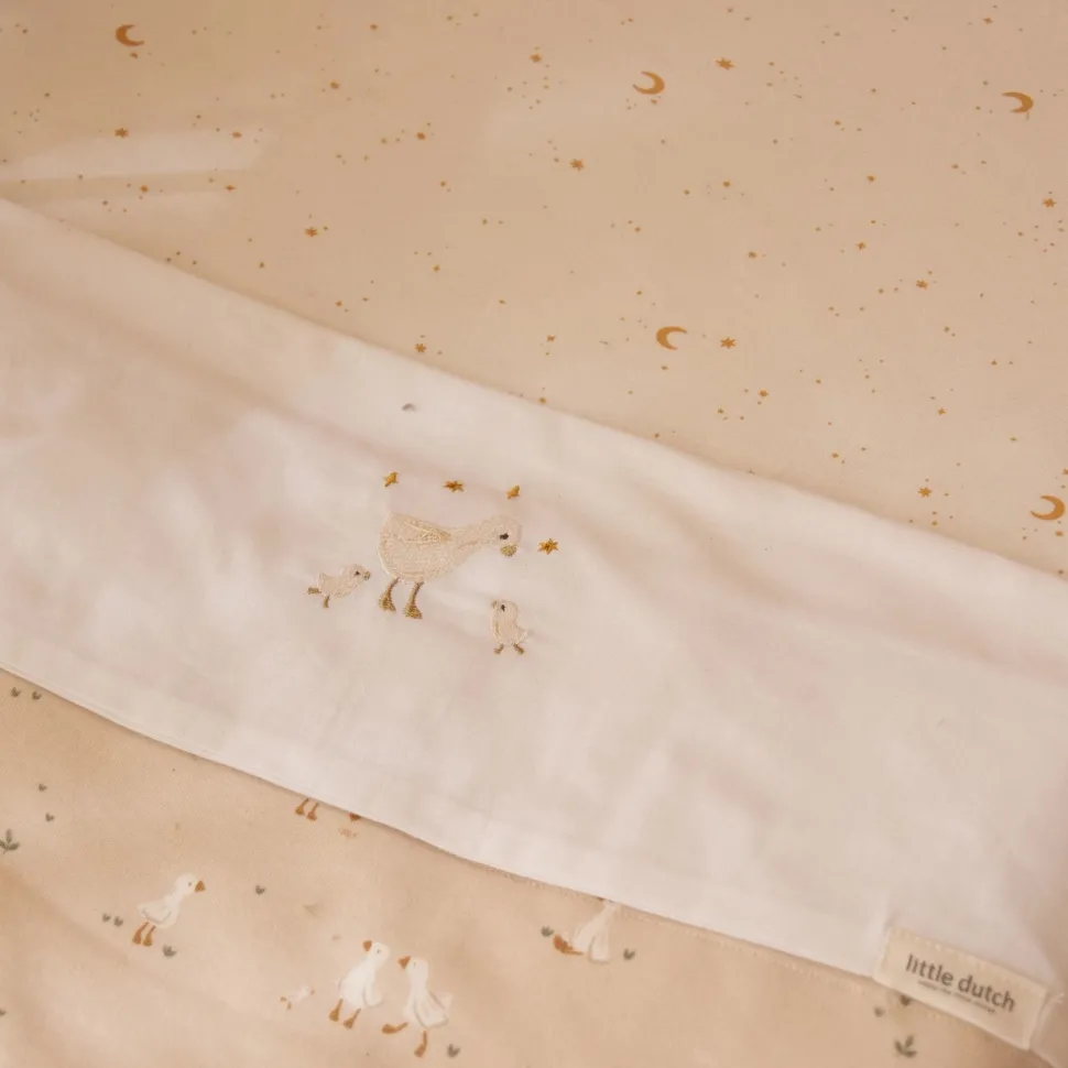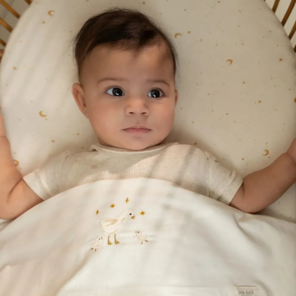 Bedek het matras van je kleintje met dit hoeslaken voor een goede nachtrust, zodat ook de kleinste sterren lekker kunnen slapen. Het zachte biologische katoen, behandeld met een perzikwassing, zorgt voor rustgevend comfort waar zelfs de wildste dromen van tot rust komen. Het elastische katoen sluit perfect om het matras en blijft mooi, zelfs na meerdere wasbeurten. De crèmekleur met de schattige Moon & Stars print brengt een dromerige sfeer in de kamer van je kindje en past prachtig bij het beddengoed van Little Dutch.